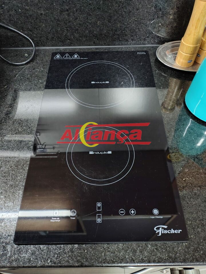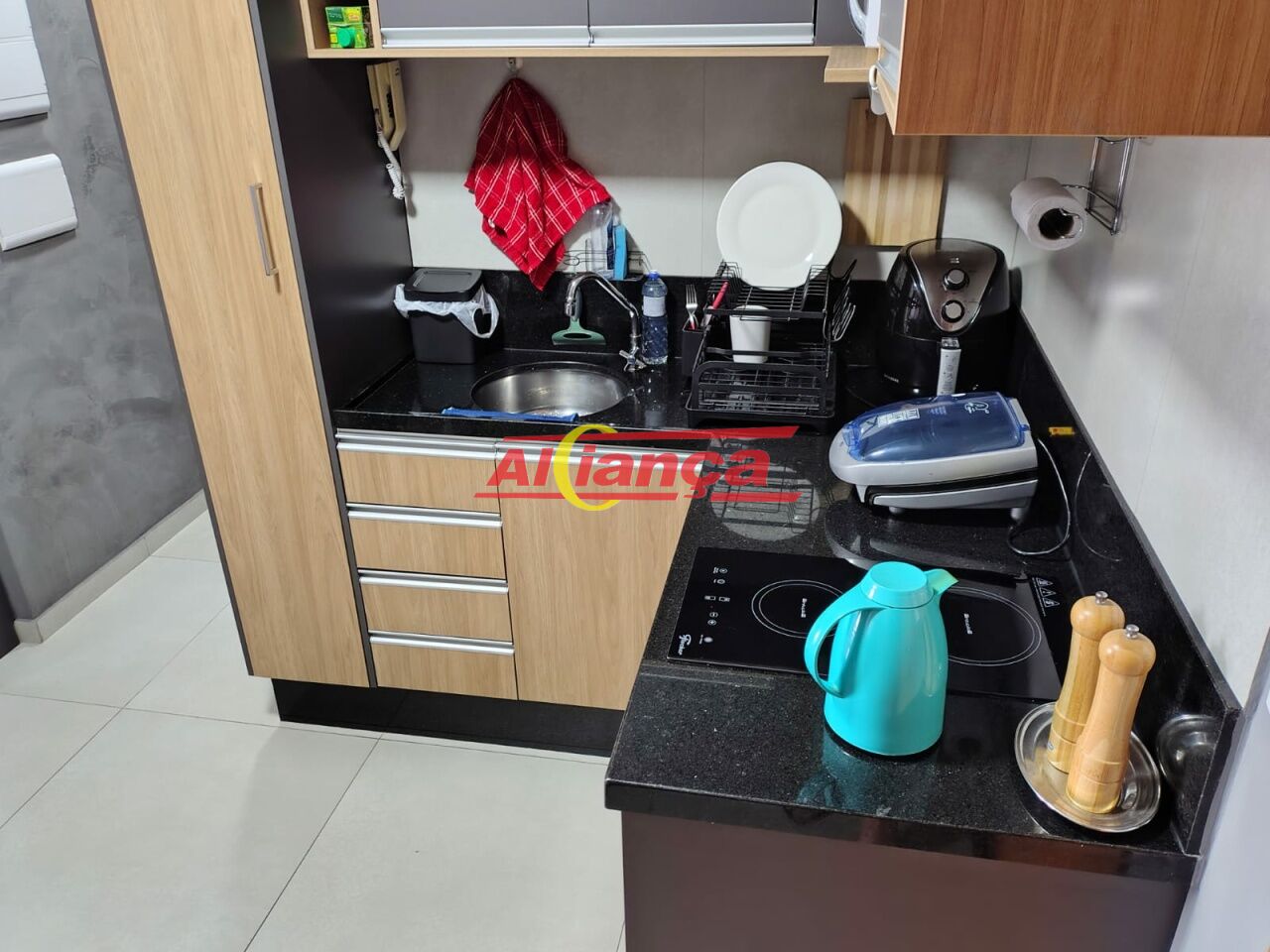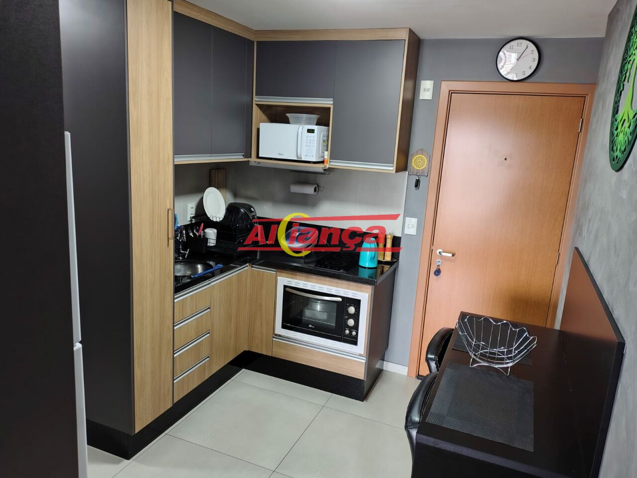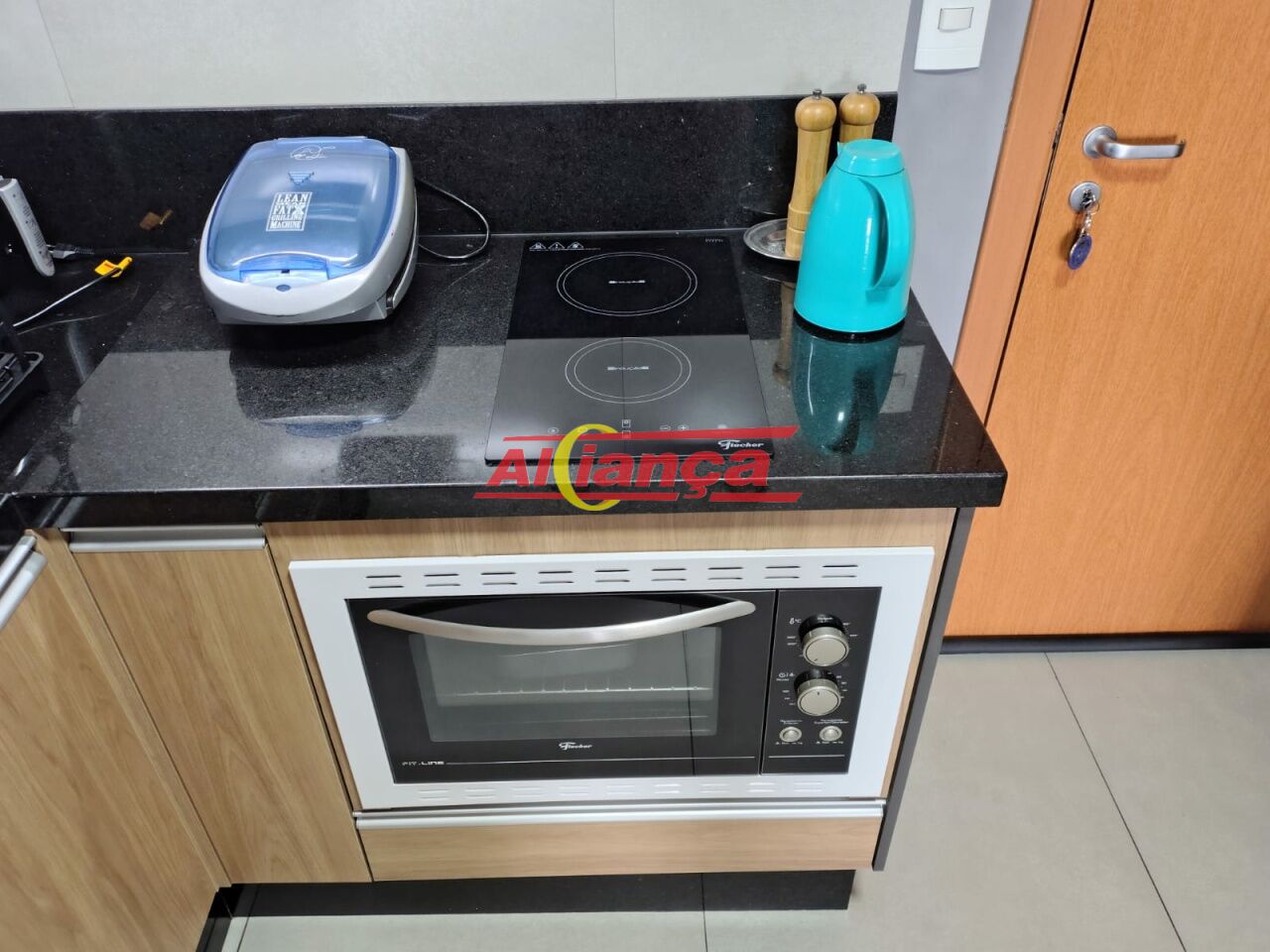 Cozinha equipada com armários planejados, fogão de indução de 2 bocas e forno elétrico.