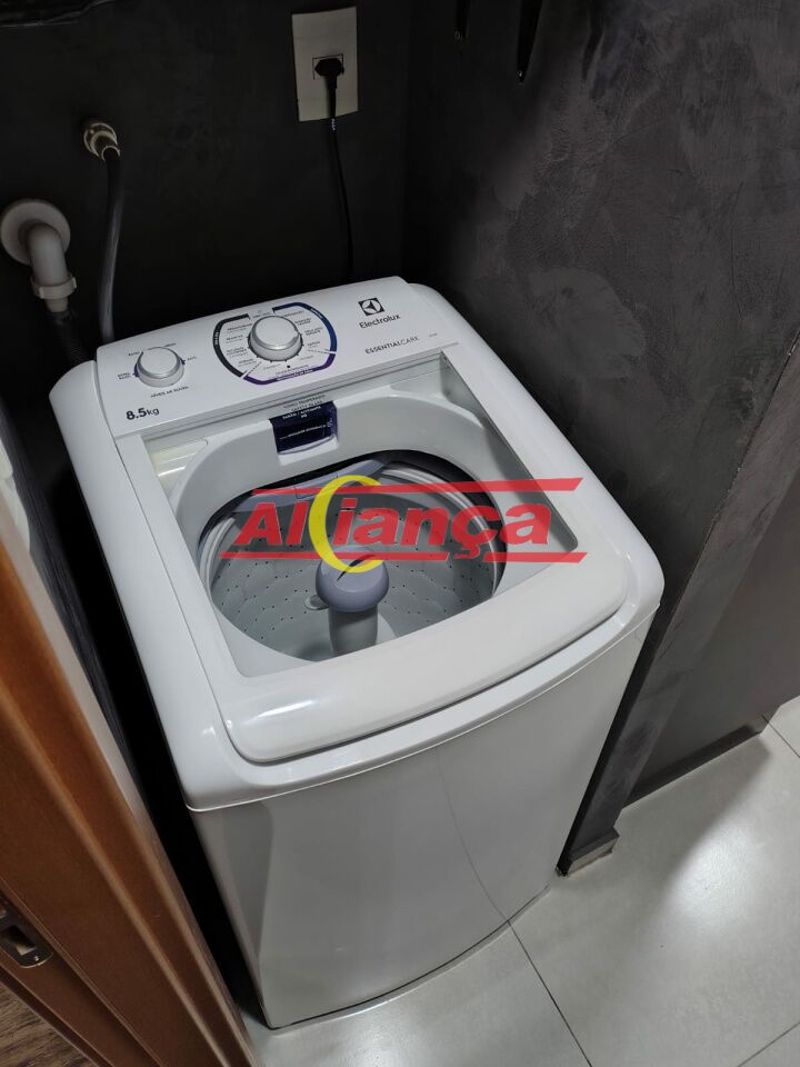 Área de serviço com armário planejado e máquina de lavar roupas.