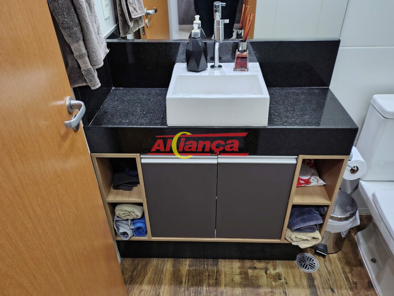 Sanitário com armários planejados, box instalado e espelho.