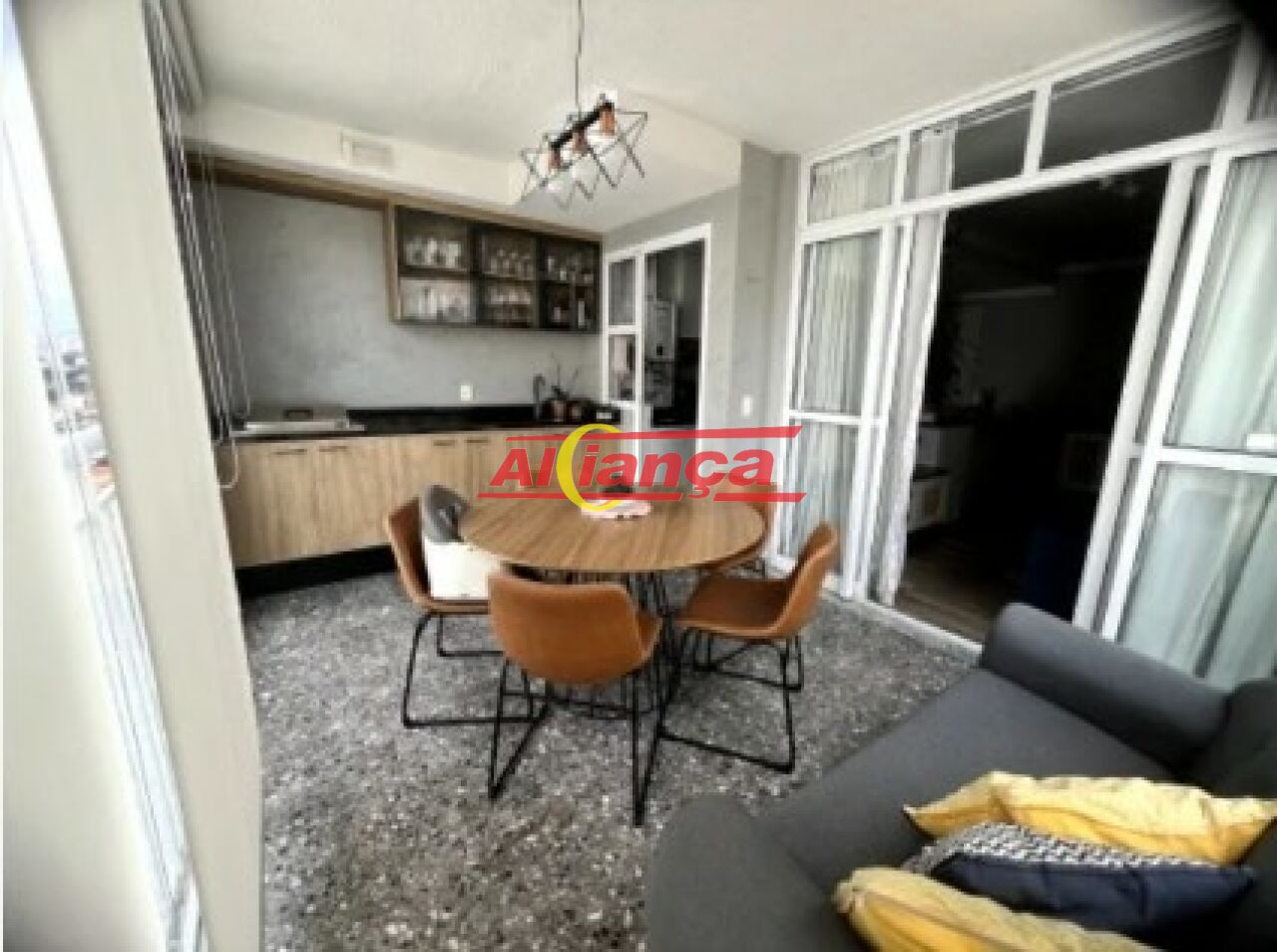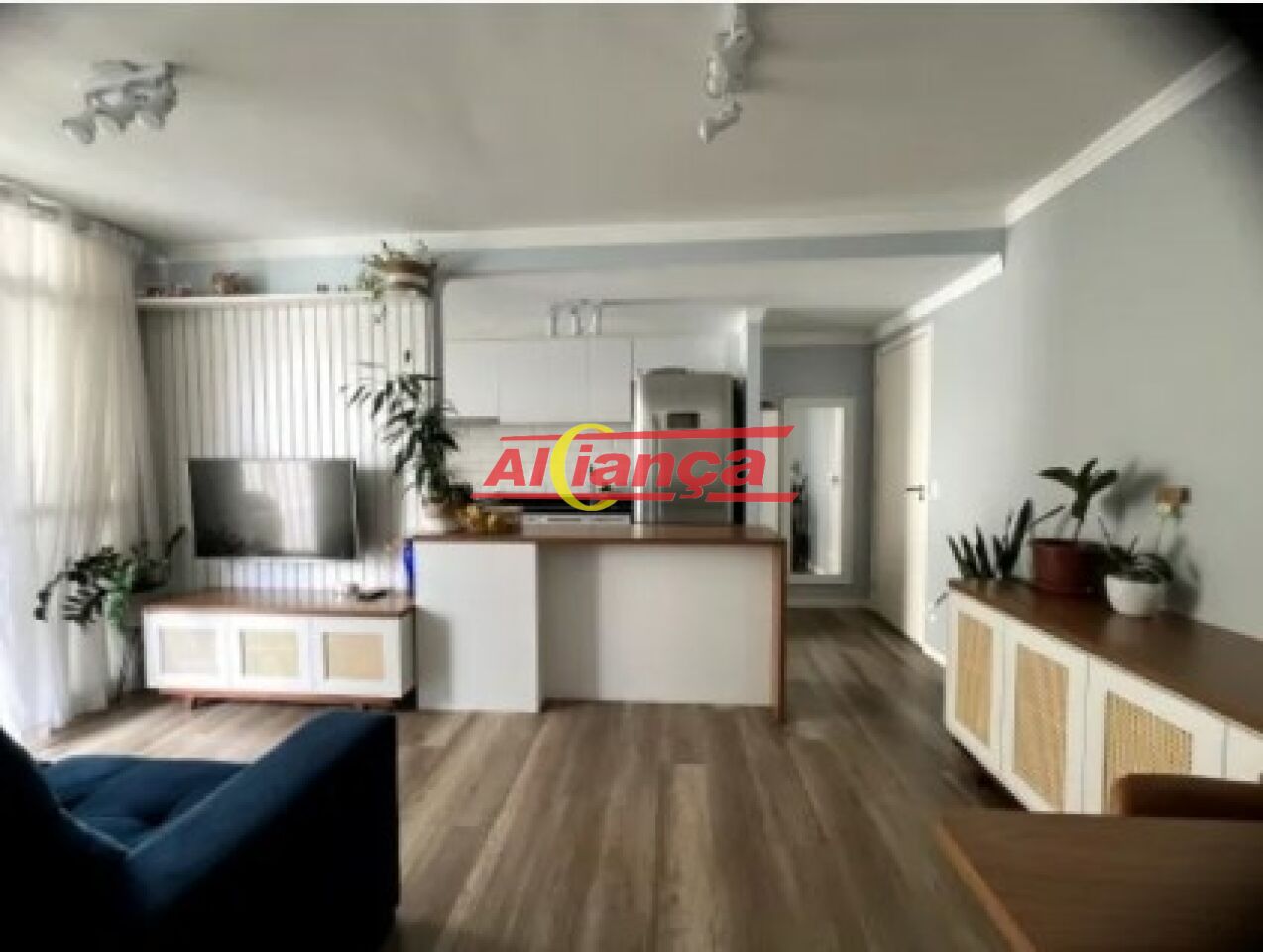 Sala ampla para dois ambientes integrada com cozinha americana