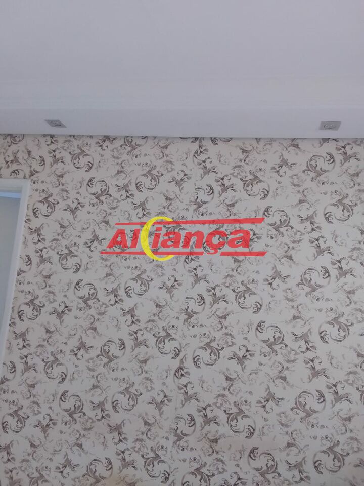 Sala aconchegante com papel de parede, teto rebaixado e iluminação