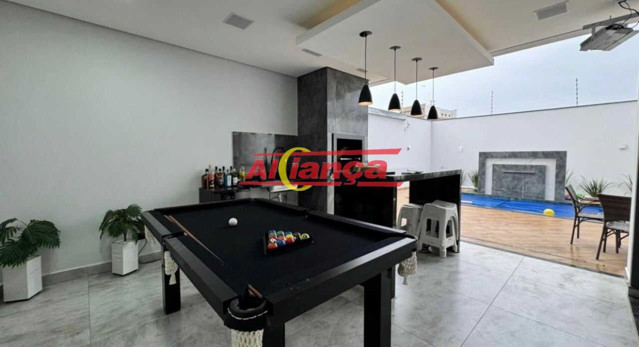 Área gourmet completa com piscina aquecida (1,60m de profundidade), iluminação em LED, cascata, churrasqueira, ilha de apoio, mesa de bilhar, projetor com tela automatizada, sistema de som JBL integrado, lavabo com chuveiro e lavanderia individualizada. Garagem para 3 veículos e fachada imponente. Toda a casa conta com interruptores digitais.