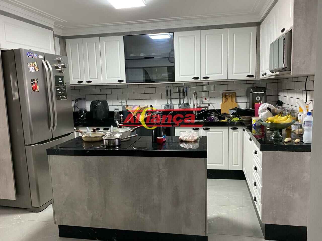 Cozinha inteira com móveis planejados, ilha central com cooktop e balcão.