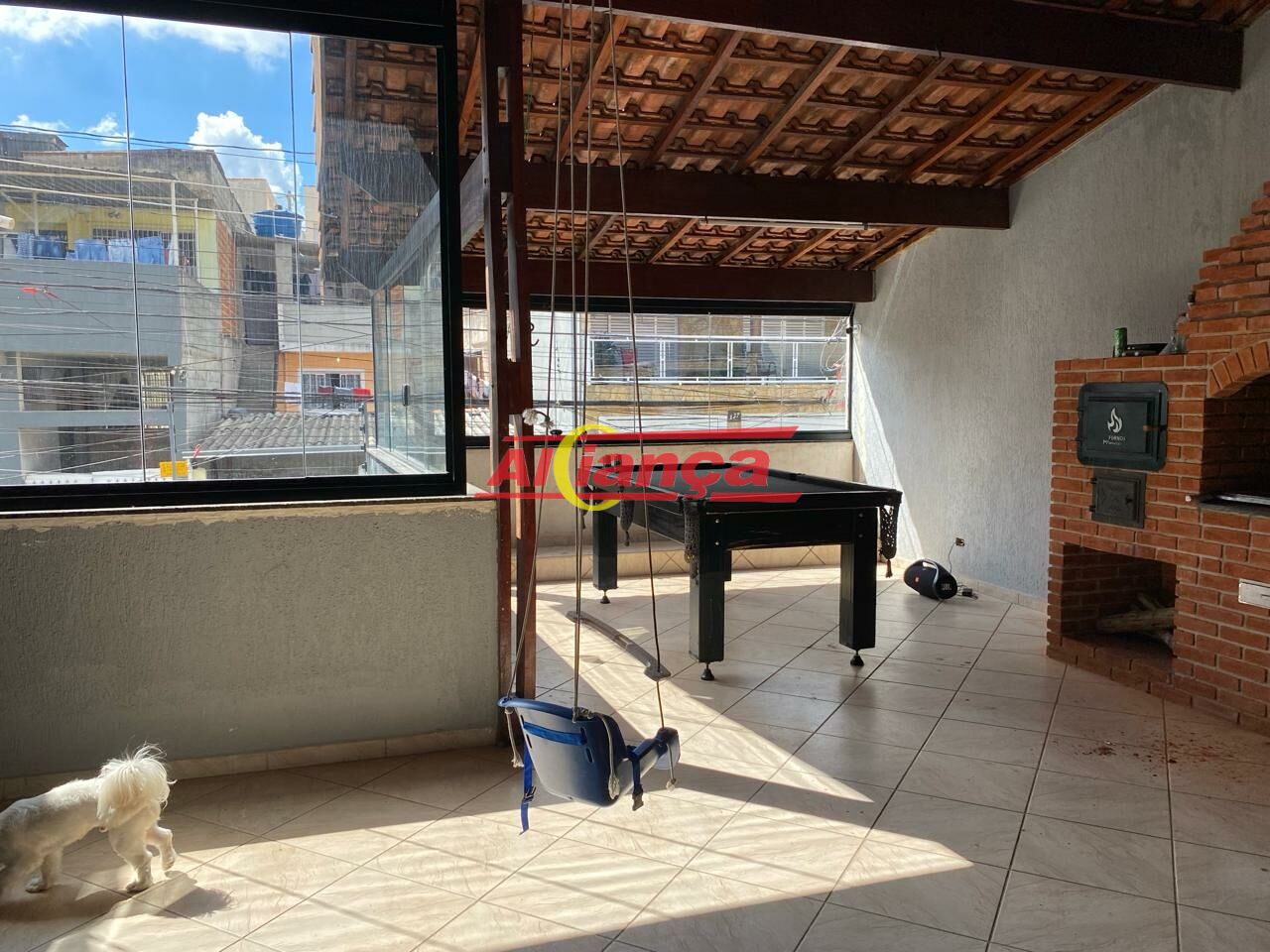Terraço com Área Gourmet coberta e com vidros em toda extensão : com churrasqueira e mesa de sinuca