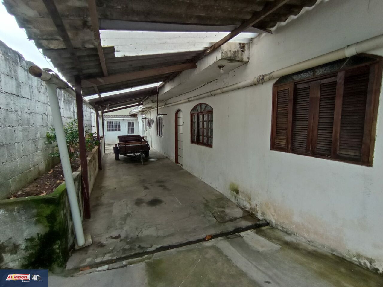 A casa possui corredor na lateral, proporcionando iluminação natural e ventilação.